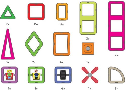 Trojúhelník 7x Vysoký trojúhelník 3x Čtverec 15x Obdélník 3x Obdélníček 3x Trojitý obdlélník 2x Kosočtverec 2x Výseč 8x Oblouk 4x Figurka 2x Jednokolečk 4x Vrtule 1x Otočný panel 1x