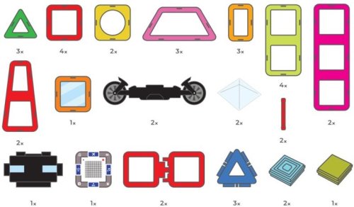 Trojúhelník 3x Čtverec 4x Čtverec s kruhovým otvorem 2x Obdélník 4x Obdélníček 3x Trojitý obdlélník 2x Lichoběžník 3x Super lichoběžník 2x Zrcadlový čtverec 1x Transform kolečko 2x Lux pyramidy 2x Nástavec s pantem 2x Nástavec trojboký 3x Nástavcová spojka 1x Spojka pro sloupek 2x Battery pack 1x Audio modul 1x GEOMAG tyčka 2x
