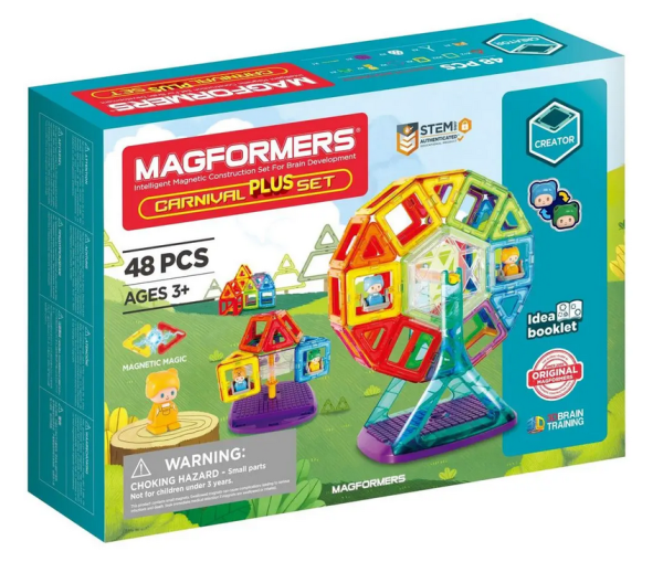 Magformers Carnival PLUS je tematická stavebnice, ze které lze sestrojit mnoho variací točících se pouťových atrakcí (houpačka, ruské kolo, kolotoč). Dva čtverce mají protáčivé sedačky pro postavičky jásajících dětí, které lze do jakékoliv atrakce zabudovat jako skutečné pasažéry. Obsahuje dostatečný počet dílků i na stavby, které postavíte z nižší řady stavebnic, např. Magformers-30. Pokud již všechny magnetické dílky naopak máte, stačí si přikoupit samostatné "Carnival příslušenství" (ovšem ve starší verzi). Počet dílků: 48 dílků + obrázkový návod: