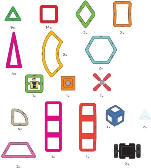 Trojúhelník 9x Vysoký trojúhelník 4x Čtverec 14x Trojitý obdlélník 1x Kosočtverec 2x Lichoběžník 2x Šestiúhelník 2x Výseč 4x Oblouk 2x Výseč mezikruží 2x SUPER oblouk 1x Figurka 1x Kolečka 2x Vrtule 1x Otočný panel 1x Lux,pyramidy trojboké 2x Nástavec krychle 1x