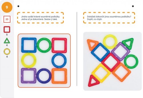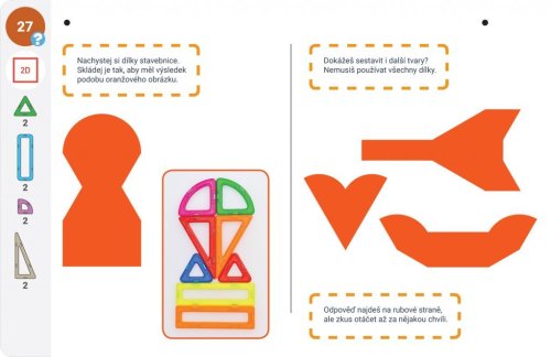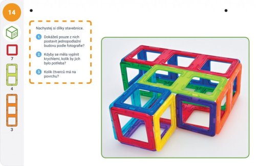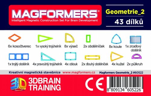 Sada Magformers Geometrie Box 2 - Rovina a prostor je rozšiřující sadou k Boxu 1. Pro výuku ve 3. až 5. třídě je tedy zapotřebí boxu 1 a boxu 2 současně. Magformers geometrie je určena k rozvíjení matematické pregramotnosti v předškolním vzdělávání a pro výuku geometrie na prvním stupni ZŠ. Lze ji využít také v rámci inkluze i při vzdělávání dětí cizinců. Balení obsahuje 36 výukových karet a 44 dílků: