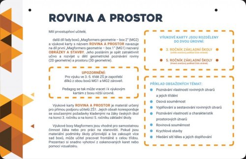 Součástí boxu je další učebnice s metodickými pokyny pro děti i rodiče. Celý projekt souborů výukových karet s dílky Magformers je realizován ve spolupráci s akreditovanou lektorkou dalšího vzdělávání učitelů, RNDr. Marií Kupčákovou, Ph.D. Geometrické karty jsou sestavené v souladu s platnými učebními osnovami, upevňují a rozvíjejí geometrické poznatky žáků, ale zároveň sledují současné požadavky na zjednodušení učební látky. Jeho posláním je opět zatraktivnit učivo a rozvíjet u dětí geometrické poznávání roviny (2D geometrie) a prostoru (3D geometrie). Výukové karty Rovina a prostor je materiál určený pro přímou podporu učitelů ZŠ nebo rodičů. Jejich obsah koresponduje se současnými požadavky kladenými na žáky českých škol na konci 3. ročníku a na konci 5. ročníku základní školy .