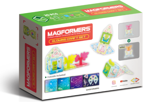 Magformers Glowing set Objevte kouzlo tvoření s Magformers svítícím setem! Tato sada obsahuje 20 magnetických dílků a vkládacích doplňků, které umožňují nekonečné možnosti stavění. Speciální Glow dílky jsou exkluzivní pouze pro tuto sadu, což ji činí ještě unikátnější. Co sada rozvíjí: