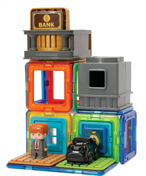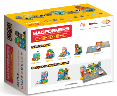 Obsahuje 12 magnetických tvarů a 10 funkčních doplňků vč. malého bankéře. Lze sestavovat různě architektonicky řešené stavby bankovního domu dle vlastní fantazie. Přidáním dalších dílků Magformers získají vaše stavby na velikosti a různorodosti. Výsledné stavby mají formu poloodkrytého průřezu, kde jsou z jedné strany patrné vnější kontury stavby a z druhé interiérové řešení, které lze postupně obměňovat. Vhodné pro kreativní kombinování s ostatními sadami série „MĚSTEČKO“ (Town set). Stavebnice série MAGFORMERS Městečko (Town set) jsou navrženy tak, aby si malí stavitelé mohli vybudovat svoje vlastní obce a města dle vlastních představ. Na výběr mají celkem 5 tematických sad: Nemocnice, Tržiště, Cukrárna, Banka a Autobus. Každou z nich můžete využít i samostatně (včetně sady Autobus, která bude ovšem sama o sobě jen malou autodráhou s autobusem a pár doplňky bez magnetů). Mnohem zajímavější bude nakombinovat 2 anebo více sad Městečka najednou (lze postupně přikupovat) nebo doplnit o jakékoliv jiné dílky stavebnic Magformers, aby celé městečko ožilo a nabídlo malým architektům netušené možnosti celou scénu rozšířit a obměňovat. Stavebnice série Městečko jsou plně kompatibilní se všemi jinými dílky Magformers. Pokud nasbíráte všech 5 typů městečka, získají stavby na pestrosti a můžete si vystavět své vlastní město dle vaší představivosti. S městečkem si můžete užít ještě více zajímavých příběhů. Sada obsahuje: 10 čtverců, 2 obdélníky, 9x plastové příslušenství a 1 postavičku Vhodné pro děti od 3 let. Počet dílků: 22 Kreativní magnetická stavebnice Magformers umožňuje sestavovat velké množství trojrozměrných objektů, pomocí dvourozměrných plastových mnohoúhelníků. Magformers procvičuje jemnou motoriku, podněcuje tvořivost, učí děti barvy a základní geometrické tvary. Rozměry dílků a vhodně volené tvary zajišťují maximální možnou bezpečnost hračky . Materiál, z kterého je stavebnice vyrobena splňuje nejpřísnější hygienická a zdravotní kritéria. Dílky jsou dostatečně velké, nelze je spolknout a jsou prakticky nerozbitné. MAGFORMERS lze velmi dobře kombinovat i se známou magnetickou stavebnicí Geomag.