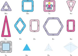Trojúhelník 16x Vysoký trojúhelník 6x Čtverec 13x Obdélníček 4x Kosočtverec 6x Šestiúhelník 2x Minivýseč 4x Oblouček 2x Figurka Princezna 1x Lux pyramidy 1x Lux,pyramidy trojboké 2x Lux pyramidy trojboké Color 4x Otočná LED lucerna 1x (obsahuje 1 kus vyměnitelné ploché baterie CR2032)