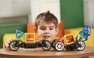 Jeden ze speciálních podvozků je obdařen masivními koly, která lze nezávisle na sobě natáčet až o 90°, takže je využijete pro modelování jedno- i dvoustopých vozidel. Druhý podvozek je již klasická náprava s 2 propojenými koly, u níž je zase možnost nastavit 3 různé výškové polohy propojovací desky, což přijde vhod pro různě odvážné karoserie čtyřkolek a bugyn. V kombinaci s jakýmikoliv dalšími dílky Magformers pestrost i velikost vozidel násobně narůstá. Většina ze stovek postavených aut a motorek z této stavebnice je i překvapivě odolná a lze je tudíž směle využívat i jako funkční hračku. Vhodné pro děti od 3 let.