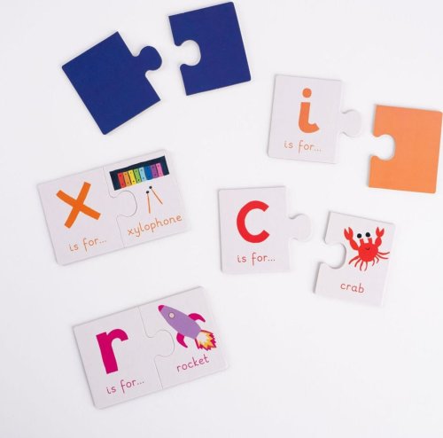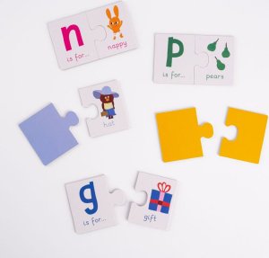 Sada obsahuje 26 samostatných dvoudílných puzzle, které podporují rozpoznávání písmen a jejich přiřazování k obrázkům a slovům (v angličtině) .