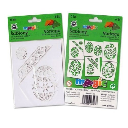 Sada 6ks papírové šablony na malování. Materiál bílý karton 220g. Doporučujeme pro malování s magickými voskovkami (technika frotáž), vhodné i pro tupování s temperami, pro malování s foukacími fixami nebo techniku malování plastelínou. Rozměry 11x14cm.
