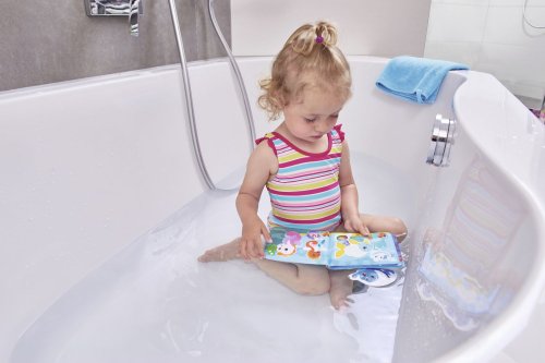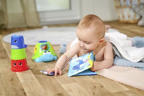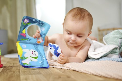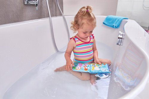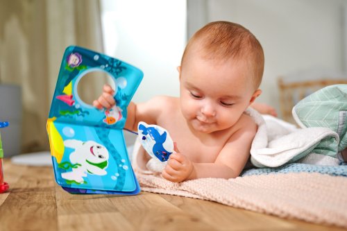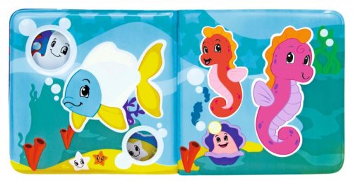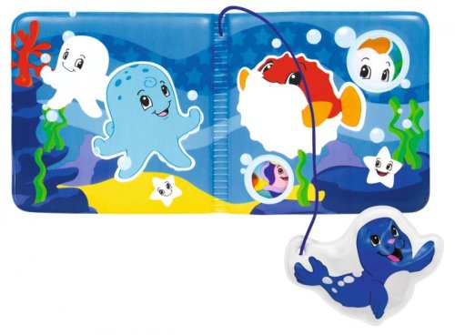 Knížka do vody pro nejmenší s pískacím přívěskem. Má 8 stran s obrázky mořských zvířátek. Rozměr zavřené knížky: 13x13cm.
