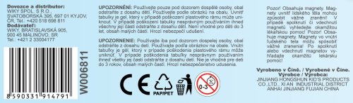 1. Riziko udušení: Zkontrolujte, zda je tabule a přiložené prvky (např. magnety, písmena, číslice) neobsahují malé části, které by dítě mohlo spolknout. Malé části představují nebezpečí udušení. 2. Riziko poranění: Ujistěte se, že tabule nemá ostré hrany, škrábance nebo třísky, které by mohly dítě zranit. Pravidelně kontrolujte stav tabule, abyste se ujistili, že je bezpečná pro použití. 3. Riziko spojené s magnety: Pokud vzdělávací tabule obsahuje magnety, ujistěte se, že jsou bezpečně připevněny a dítě je nemůže snadno odstranit. Při požití magnetů může dojít k vážným vnitřním zraněním. 4. Stabilita tabule: Umístěte tabuli na stabilní povrch, abyste zabránili jejímu převrácení a způsobení zranění u dítěte. 5. Čištění a údržba: Čistěte tabuli pravidelně pomocí bezpečných, netoxických čisticích prostředků. Vyhněte se použití agresivních chemikálií, které by mohly poškodit povrch tabule nebo představovat nebezpečí pro dítě. 6. Bezpečný dohled: Při používání vzdělávací tabule vždy dohlížejte na dítě, abyste předešli možným nehodám a ujistili se, že je tabule používána bezpečným způsobem. 7. Skladování: Uchovávejte tabuli mimo dosah dětí, když se nepoužívá, zejména pokud obsahuje malé části, které mohou představovat nebezpečí udušení. 8. Upozornění na věk: Zkontrolujte věková doporučení výrobce, abyste se ujistili, že tabule je vhodná pro věk dítěte. Tabule nevhodné pro daný věk mohou představovat nebezpečí.