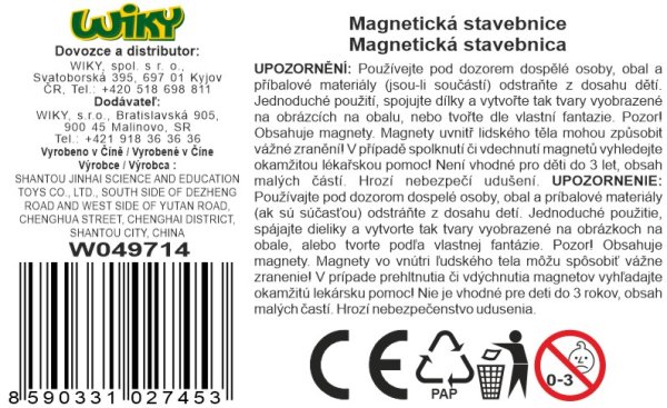 1. Riziko spolknutí: Upozorňuji, že magnetické kostky obsahují malé části, které mohou děti spolknout, což představuje riziko udušení nebo vážného vnitřního zranění. Dohlížejte na zábavu dětí a ujistěte se, že jsou kostky uloženy mimo dosah malých dětí. 2. Nebezpečí pomačkání: Magnety v kostkách jsou silné a mohou se přitahovat velkou silou, což způsobuje riziko přiskřípnutí prstů nebo jiných částí těla. Při hraní buďte opatrní a ujistěte se, že si děti jsou tohoto nebezpečí vědomy. 3. Vnitřní poranění: Při požití více než jednoho magnetu může způsobit vážné vnitřní poškození. Magnety se mohou přitahovat uvnitř těla, což způsobuje perforaci střev, infekce nebo smrt. Okamžitá lékařská pomoc je nezbytná v případě spolknutí magnetů. 4. Poškození hračky: Pravidelně kontrolujte magnetické kostky z hlediska poškození, jako jsou praskliny, zlomeniny nebo odhalené magnety. Poškozené bloky je nutné okamžitě odstranit, aby se zabránilo možným zraněním. 5. Upozornění pro děti: Ujistěte se, že magnetické kostky jsou vhodné pro věk dítěte. Některé sady mohou obsahovat malé prvky nebo silné magnety, které nejsou vhodné pro malé děti. Vždy dodržujte věkové doporučení uvedené výrobcem. 6. Bezpečné použití: Vysvětlete dětem, jak si bezpečně hrát s magnetickými kostkami a zdůrazněte riziko spolknutí a přiskřípnutí prstů. Dohlížejte na zábavu dětí, zejména těch mladších 6 let. 7. Skladování: Magnetické kostky uchovávejte na bezpečném místě mimo dosah malých dětí, když se nepoužívají. To zabraňuje náhodnému spolknutí magnetů. 8. Likvidace: Opotřebované nebo poškozené magnetické bloky je třeba likvidovat zodpovědně v souladu s místními předpisy. Nevyhazujte je do běžných odpadků, abyste zabránili náhodnému přístupu dětí k magnetům. 9. Interakce s lékařskými zařízeními: Lidé s implantovanými zdravotnickými zařízeními, jako jsou kardiostimulátory, by měli být při používání magnetických bloků opatrní. Magnety mohou narušovat fungování těchto zařízení. Pokud máte jakékoli obavy, poraďte se s lékařem. 10. Věkové omezení a kompetence: Magnetické kostky by měly používat děti, které jsou dostatečně vyvinuté, aby pochopily potenciální rizika a dodržovaly bezpečnostní pravidla.