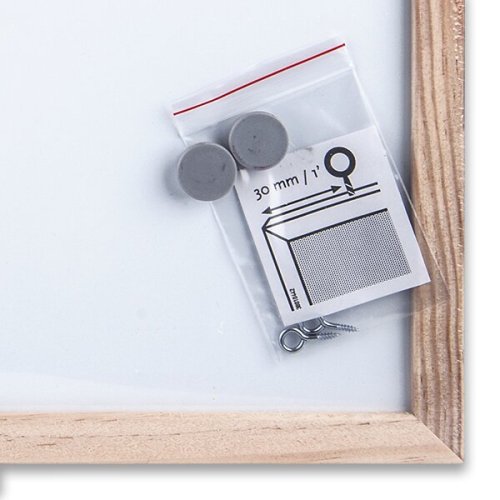 Bílá magnetická tabule v dřevěném rámu, součástí jsou háčky na zavěšení, 2 magnety a černý fix na magnetickou tabuli. Rám je ze dřeva borovice o tloušťce 1,8 cm.