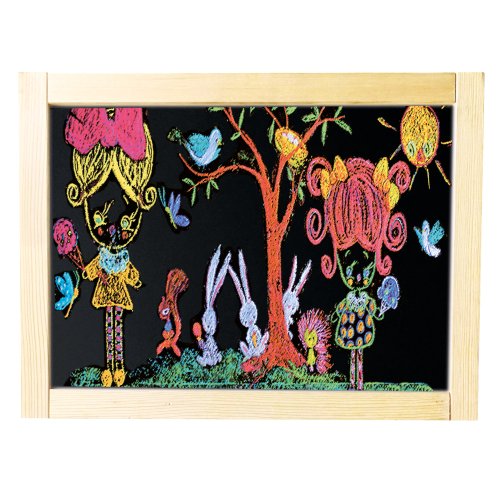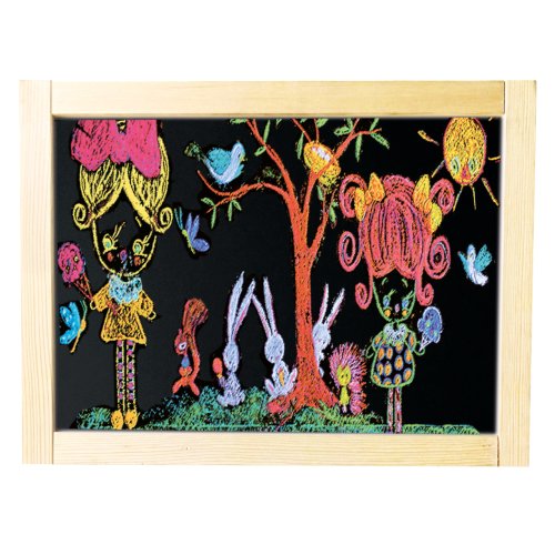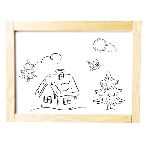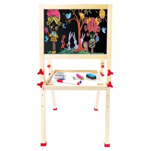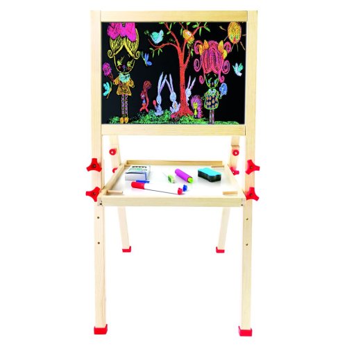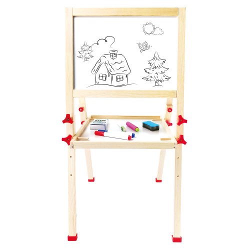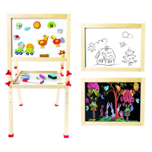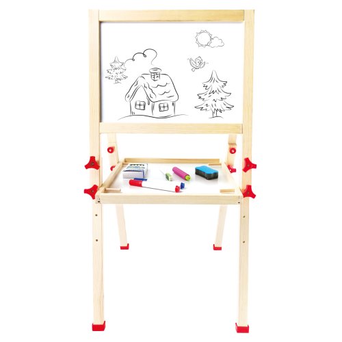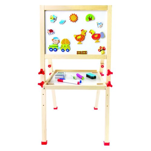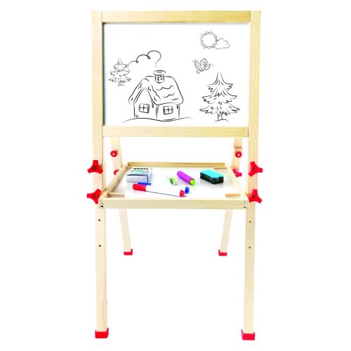Dětský dřevěný skládací stojan. Obsahuje 61 dílů. Jedna strana stojanu je bílá a magnetická, na kterou se dají magnetem přichytit různé obrázky, které jsou součástí balení, nebo je určena pro psaní fixou.