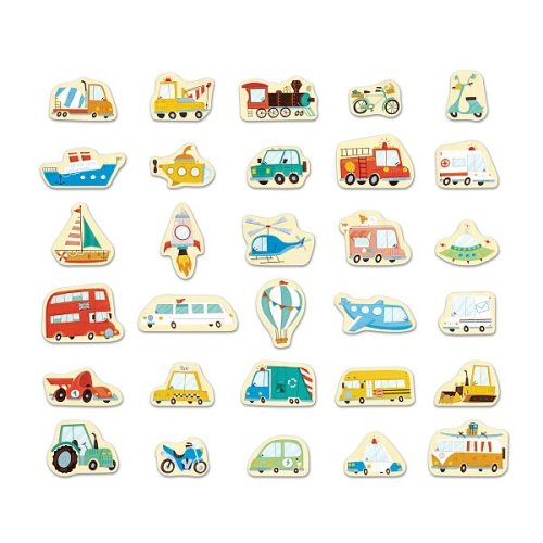 Sada magnetů s vozidly, která obsahuje 30 klasických vozidel, včetně aut, motocyklů, letadel, lodí a dokonce i UFO. Když se děti učí o různých způsobech dopravy, mohou si na základě vozidel vytvářet vlastní příběhy, což zvyšuje jejich jazykové a komunikační dovednosti. Lze používat na stojanu Hape nebo jako hračku na ledničku, tyto magnety přilnou na jakýkoli kovový povrch. Rozměr balení: 24,1x24,1x4,1 cm. Věk 18m+