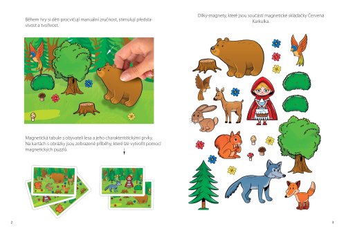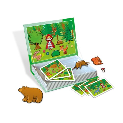 Zahrajte si vlastní příběhy s pohádkovými postavami. Magnetická vzdělávací hra ve formě knížky, pro děti od 4 let. Rozvíjí nejen jemnou motoriku a představivost, ale také probouzí fantazii a při popisování příběhů a zlepšuje vyjadřovací schopnosti. Hra obsahuje magnetické pozadí, na který děti skládají obrázkové magnetky, podle vzoru na kartičkách, které jsou součástí balení. Hra funguje i jako magnetické divádélko, kde si děti mohou také vytvářet vlastní kombinace a příběhy, které pak vypráví svým rodičům nebo učitelům. Tato hra rozvíjí nejen jemnou motoriku a představivost, ale také probouzí fantazii a při popisování příběhů a zlepšuje vyjadřovací schopnosti. Díky magnetům jednotlivé dílky drží na podkladové desce a hra je proto vhodná i na dlouhé cesty v autě. Balení obsahuje: 25 ks magnetických dílkůmagnetická tabule8 kartiček s příběhyčeský a slovenský návod ke hře Hlavní vlastnosti: rozvíjí obrazotvornost a fantazii pomáhá zlepšovat motoriku prstů pomáhá s rozvojem vyjadřování, při vyprávění a popisu scének