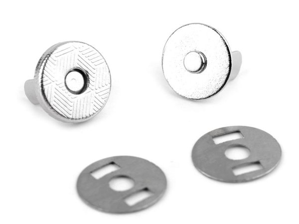 Malé magnetické zapínání využijete na uzavírání peněženek, psaníček i menších tašek a kabelek. Návod na použití: 1) Podle nožiček na magnetu si vyznačíme průřezy a prostřihneme látku. 2) Nožičky magnetu prostrčíme tak, aby projely látkou a vykoukly na rubové straně. 3) Na nožičky nasadíme kovový protikus, stiskneme k sobě a nožičky roztáhneme do stran. 4) Druhý díl nasadíme stejným způsobem a magnety můžeme zapnout.