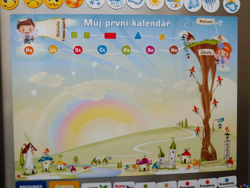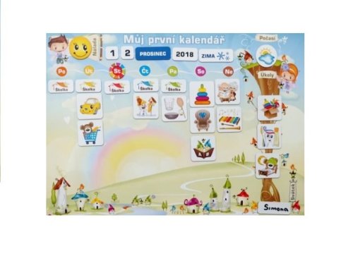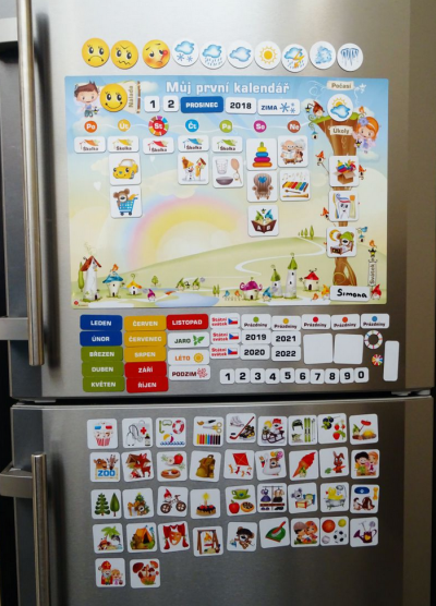 Originální magnetický kalendář pro děti, které si rády hrají s magnetkami. Děti se zábavnou formou učí plánovat své oblíbené činnosti, úkoly, poznávat barvičky, základní tvary a spoustu další zábavy. Kalendář má magnetickou podložku v rozměru 420 x 297 mm, která se "přichytne" např. na ledničku (nebo na plechovou tabuli) a 114 magnetek, které si děti přikládají na podložku. Všechny magnetky mají zaoblené rohy.