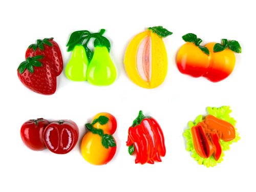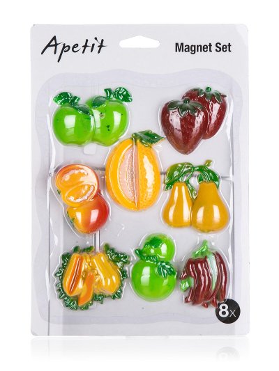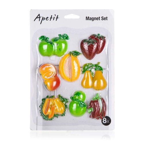 8dílná sada ozdobných magnetek APETIT na lednici s motivem ovoce a zeleniny. Magnetky slouží nejen jako dekorace v kuchyni, ale mohou najít i praktické využití např. na připevnění receptů na lednici.