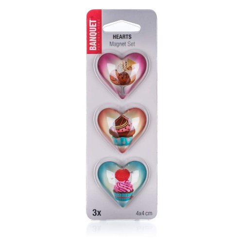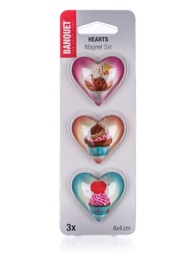 Sada 3 ks ozdobných magnetek na lednici s dekorem HEARTS. Magnetky slouží nejen jako dekorace v kuchyni, ale mohou najít i praktické využití např. na připevnění receptů na lednici.