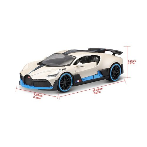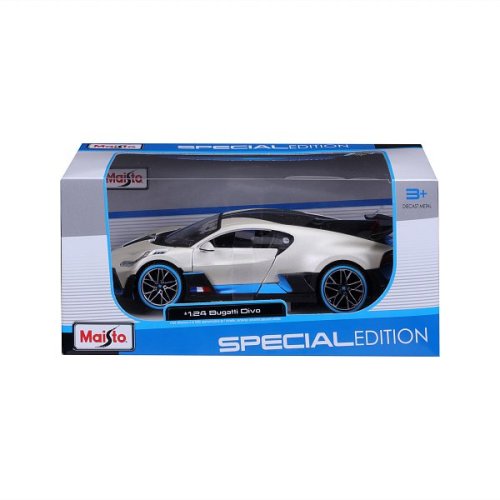 Special Edition 1:24 Bugatti Divo. Modely Special Edition jsou sbírkou krásného designu s vysokým důrazem na přesnost detailů. Modely jsou vyrobeny z litého kovu s plastovými detaily. Modely v měřítku 1:24 patří mezi nejoblíbenější. Většina z modelů Special Edition má otevírací dveře, kufr nebo kapotu. Baleno v krabičce. Nevhodné pro děti do 3 let. Rozměry balení: 10,5 x 23,3 x 11,4 cm. Věk 3+