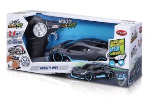 Bugatti Divo 1:24 RC Premium. Model sportovního vozu značky Maisto na dálkové ovládání. V autíčku je zabudovaná lithiová baterie, kterou lze dobíjet přes USB kabel (je součástí). Ovladač funguje na 2xAAA baterie (jsou součástí). 2,4 GHz – až 4 osoby. Pistolový ovladač. Dosah ovládání až 35 m. Doba nabíjení 45 minut. Rozměry balení: 13,3 x 31,75 x 11,1cm. Věk: 5+