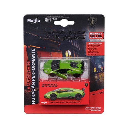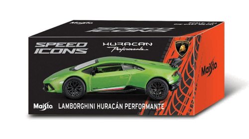 Speed Icons 1:64 Lamborghini Huracan Performante zelené. Modely Speed Icons jsou sbírkou těch nejzajímavějších, nejúžasnějších a nejvýkonnějších vozidel, která svět nabízí. Od super vozů za vysoké ceny až po nejšílenější, nadmíru výkonná moderní auta. Nová úroveň designu a pozornost věnovaná detailům jako žádná jiná. Karoserie i podvozek jsou vyrobeny z litého kovu. Model v měřítku 1:64 má otevírací dveře, dvoudílná kola s odpružením a pneumatikami ze skutečné pryže. Baleno v prémiovém úložném boxu. Nevhodné pro děti do 3 let. Rozměry balení: 17,8 x 14 x 5 cm. Doporučený věk 8 +