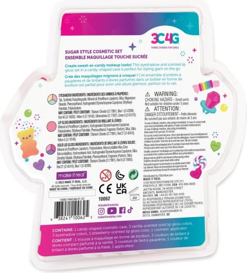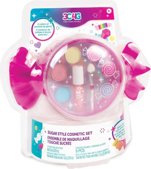 Vezměte si tuto sladkou kosmetickou sadu na cesty! Tato sada s pestrou nabídkou očních stínů a voňavého lesku na rty je uložená v roztomilém pouzdře ve tvaru bonbónu. Sada obsahuje: pouzdro ve tvaru bonbónu, 3 barvy tuhého lesku na rty s vůní vanilky, 3 barvy očních stínů, 1 tekutý lesk na rty s vůní jahod, aplikátor. Vhodné pro děti od 8 let.