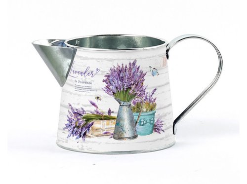 Plechová konev s motivem levandule v barevné barvě, ideální pro romantické a venkovské interiéry. Její rozměry jsou 185x115x105mm.