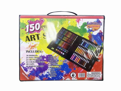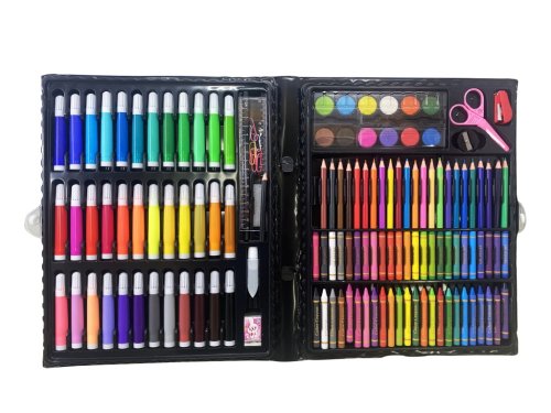 Uvnitř kufříku naleznete celkem 150 kusů výtvarných potřeb, mezi nimiž je 36 fix v různých barevných odstínech, 20 voskovek, 24 olejových pastelů a 24 barevných tužek. Součástí jsou také 12 akvarelových barev uložených v paletě, které lze použít s přiloženým štětcem. Dále obsahuje praktické pomůcky jako nůžky, sešívačku, gumu, pravítko a ořezávátko, které doplňují základní sadu pro tvorbu. Pro lepší organizaci a upevnění papírů slouží 20 kancelářských spon.