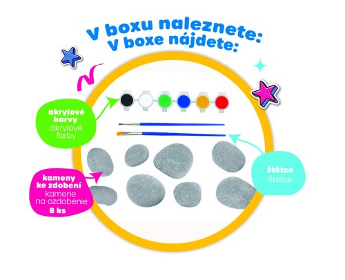 Tento set přináší dětem možnost proměnit obyčejné kamínky v originální barevná dílka. Stačí vzít štětec, barvy a nechat pracovat fantazii. Vhodné pro děti od 4 let.