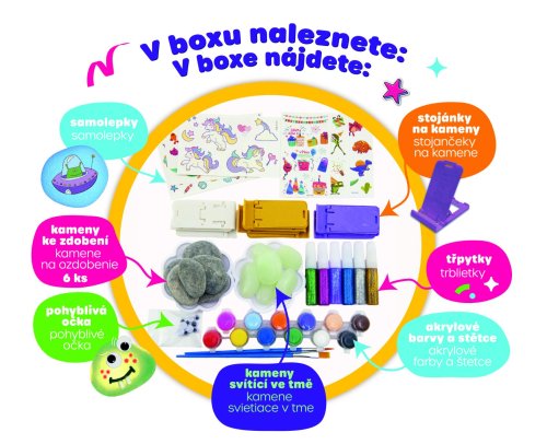 S touto sadou se každý kámen promění v malý umělecký klenot – a některé dokonce svítí ve tmě! Děti si užijí nejen kreativní malování, ale i překvapení, když jejich výtvory večer jemně zazáří. Vhodné pro děti od 4 let.