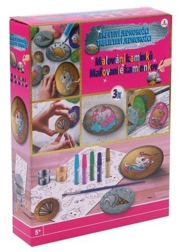 Namalujte si třpytivé jednorožce na kameny a dozdobte kamínky dle fantazie, Sada obsahuje 3 kamínky, štětec, 5 třpytivích barev, 1 zlatou barvu, 1 stříbrnou barvu a samolepky.