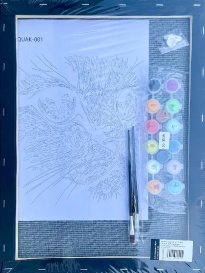 plátno na rámu o velikosti 40 x 50 cm s obrazovou předlohou s očíslovanými plochami, sadu akrylových barev, sadu tří různě velkých štětců.