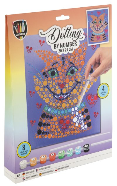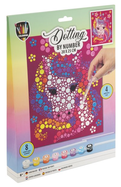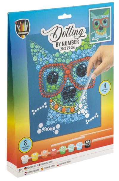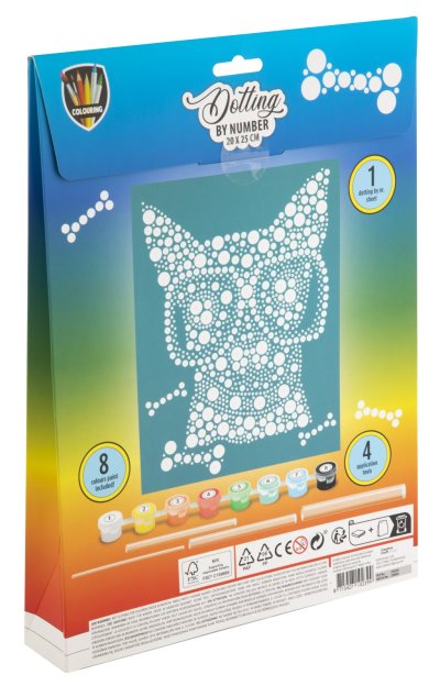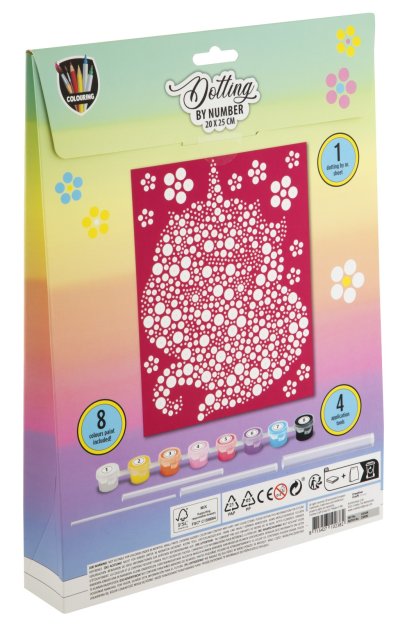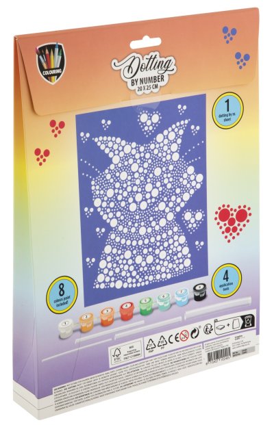 Malování pomocí teček a čísel 20×25 cm – sada obsahuje obrázek, který se vybarvuje pomocí teček dle předtištěných čísel, součástí je 8 ks vodových barev a aplikátory.