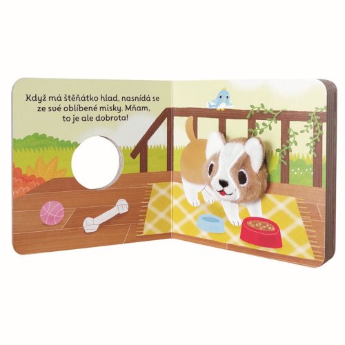 Pomocí maňáska oživíte roztomilý příběh štěňátka, které poznává svět kolem sebe. Veselé štěňátko ochutná první psí dobroty, seznámí se s veverkou a objevuje radost z aportování klacíku, či válení se v měkké trávě.