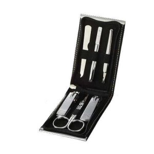 Černá minimalistická manikúrní sada obsahuje 6 základních nástrojů: dvoje kleštičky na nehty, pinzeta manikúrní zkosená, nůžky na kůži, pilník, zatlačovač kůžičky.