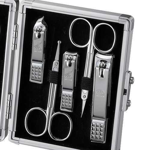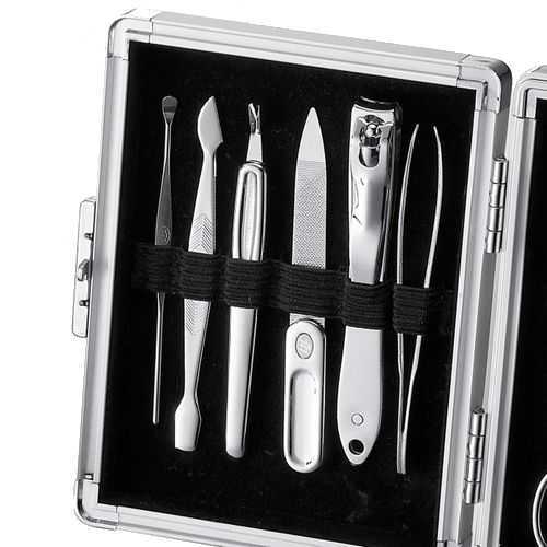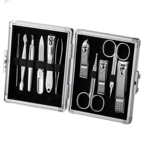 Velká manikúrní sada obsahuje 11 nástrojů pro kompletní manikúru. V sadě nalezenete: čtvery kleštičky na nehty, manikúrní zkosená pinzeta, nůžky na nehty, nůžky pro děti (kulaté špičky), pilník, manikúrní tyčinka, zatlačovač kůžičky, seřezávač kůžičky. Kvalitní pevné pouzdro v kovové imitaci. Precizní zpracování všech nástrojů ze speciální nerezové oceli.