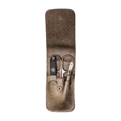 Cestovní manikúrová třídílná sada Pfeilring Solingen v zajímavém bronzově metalickém obalu z pravé kůže.