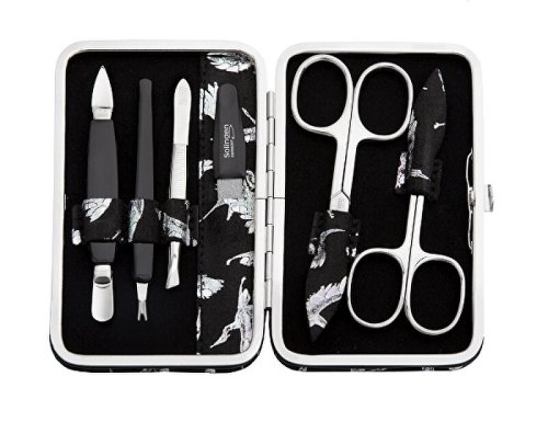 6 dílná sada manikúry v krásném pouzdře z černého semiše zdobeného stříbrnými ptáčky. Díky kompaktnímu tvaru pouzdra můžete brát manikúru všude s sebou.