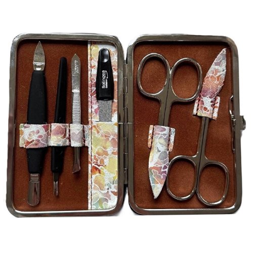 Manikúrová sada v květinovém designu obsahuje kvalitní manikúrové nástroje k úpravě nehtů. Rámečková manikúrová sada z pravé kůže obsahuje nůžky na nehty, nůžky na nehtovou kůžičku, safírový pilníček na nehty 8 cm, šikmou pinzetu, vidličku na úpravu nehtového lůžka a oboustranný manikúrový nástroj.
