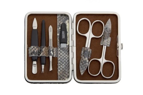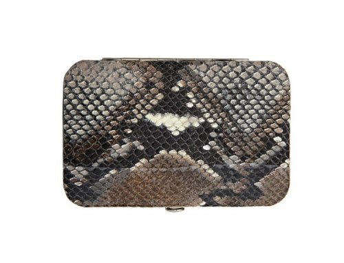 Značková kožená manikúra pro pohodlnou úpravu vašich nehtů. Elegantní a luxusní 6 dílná sada na manikúru v hnědo-šedém koženém pouzdře s motivem hadí kůže.