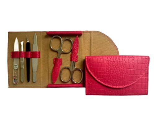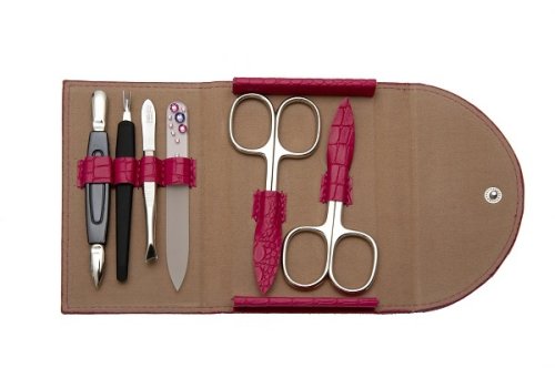 Růžová manikúrní sada v koženém pouzdře pro dokonalou úpravu nehtů. Nástroje jsou vyrobeny z niklu.