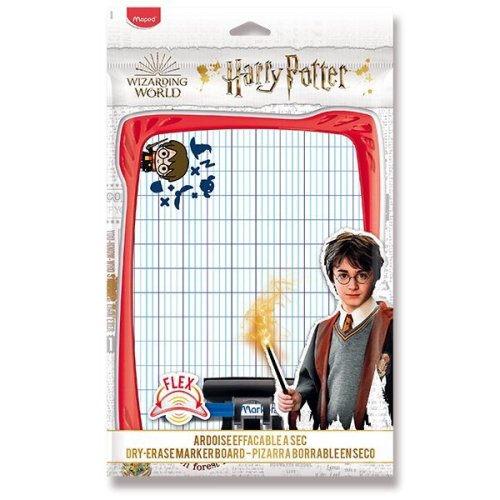 Bílá popisovatelná tabule s příslušenstvím s atraktivním motivem Harryho Poterra. Balení obsahuje tabulku, držák tabule, stěrku a popisovač. Oboustranná. Jedna strana s potiskem, druhá bez potisku. Rozměry: 20,5 x 29 cm