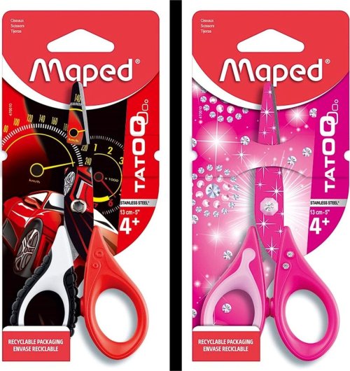 Dětské nůžky dekorované speciálním lakem. Celosvětově patentovaná technologie od Mapedu. Velikost 13 cm, zaoblené špičky. Vynikající kvalita stříhání. Varianta "Boy" s rukojetí připomínající pneumatiku, varianta "Girly" s ozdobnými štrasovými kamínky. Poznámka: Fotografie je ilustrativní, barevné provedení nůžek dodáváme dle aktuálních skladových zásob.