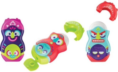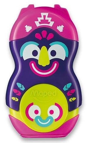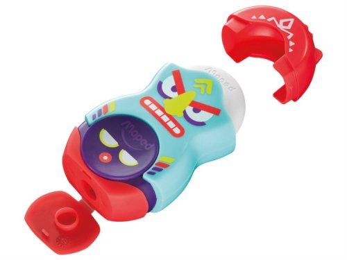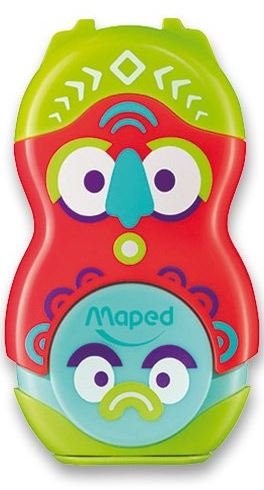 Plastové ořezávátko s odpadní nádobkou na tužkové hobliny v kombinaci s gumou. Pryž je otočná a neobsahuje PVC. Velikost výrobku je cca 7 x 4 x 2 cm.