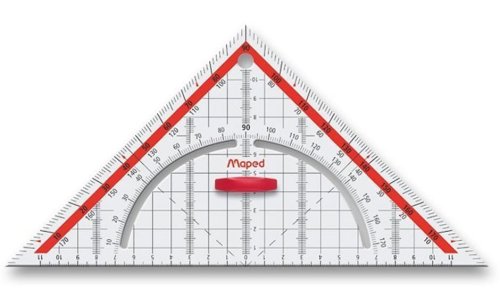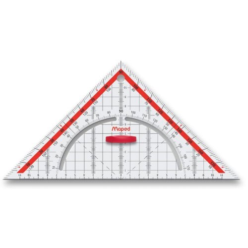 Trojúhelník s geometrickými funkcemi, 16 cm přeponou a držadlem. 4 funkce: trojúhelník se stupnicí symetrické čáry paralelní čáry úhloměr