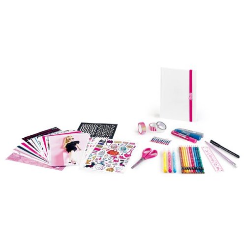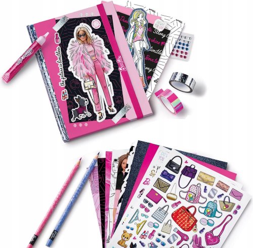Sada obsahuje:, * zápisník, * 200 samolepicích etiket s obrázky módních doplňků, * 25 archů s motivy Barbie, * sadu flitrů, * nůžky, * pravítko, * 10 pastelek, * 3 fixy, * 3 fashion samolepicí pásky, * šablonu