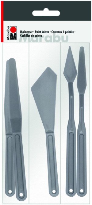Pět různých plastových uměleckých špachtlí pro práci s pastovitými barvami, strukturovanými pastami a gely.