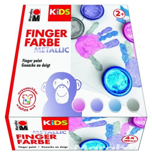 Marabu prstové barvy metalické 4x100ml sada. S touto sadou 4 barev na prsty Marabu KiDS začnou první obrázky těch nejmenších jiskřit a třpytit se! Třpytivý kovový efekt rozzáří dětské oči. Vytváření prvních uměleckých děl s malíčky je s touto krémovou, snadno roztíratelnou vodou ředitelnou barvou snadné. Je zvláště vhodný pro malování v předškolním zařízení, ve škole, na terapii i doma. Marabu KiDS Finger Paint lze nanášet prsty, rukama, houbičkou, špachtlí nebo štětcem na papír, lepenku, dřevo, sklo (okna) a film. Všechny barvy lze vzájemně míchat, nekapají, mají velmi dobré krytí a rychle zasychají. A když se malí umělci zapatlají, barva Marabu Finger Paint se snadno setře ze všech hladkých povrchů; stopy barvy na tkaninách by měly být před praním namočeny ve studené vodě. Barva je vhodná pro děti starší 2 let. Marabu KIDS Finger Paint splňuje požadavky směrnice o hračkách. To znamená, že se při jeho přípravě používají pouze speciální konzervační látky a pigmenty a přidává se hořká látka, která chrání před nežádoucí spotřebou.Obsah: 4 x Fingerpaint 100 ml (Metallic-Rose 733, Metallic-Violet 750, Metallic-Blue 752, Metallic-Silver 782)