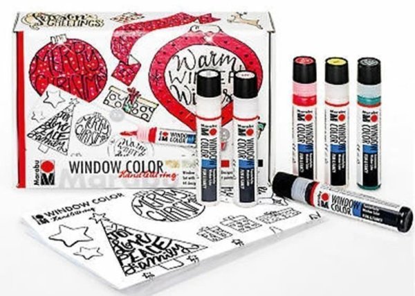 Sada slupovacích barev ke zdobení hladkých povrchů. Sada barev oken "Handlettering Xmas" • odnímatelná průhledná barva • Na vodní bázi • vysoký lesk • zářivé barvy • Měkká lakovací láhev s jemnou špičkou zaručuje příjemnou práci • Velmi snadné použití: malování, odlepování, hotovo! Sada obsahuje: - 6 x Window Color zábava a fantazie 25 ml v barvách: třpytivé zlato, třpytivé stříbro, jedle zelená, rubínově červená, bílá, kontura černá - 1 x DIN A3 omalovánka se 44 motivy (zimní ruční nápisy a krásné vánoční motivy) - 1 x malířská fólie A4 Příklady použití: - na zdobení oken, zrcadel, skla, porcelánu, dlaždic a mnoha dalších hladkých povrchů - vykouzlete skvělé motivy ručního písma na oknech, lahvích, sklenicích a jiných hladkých površích